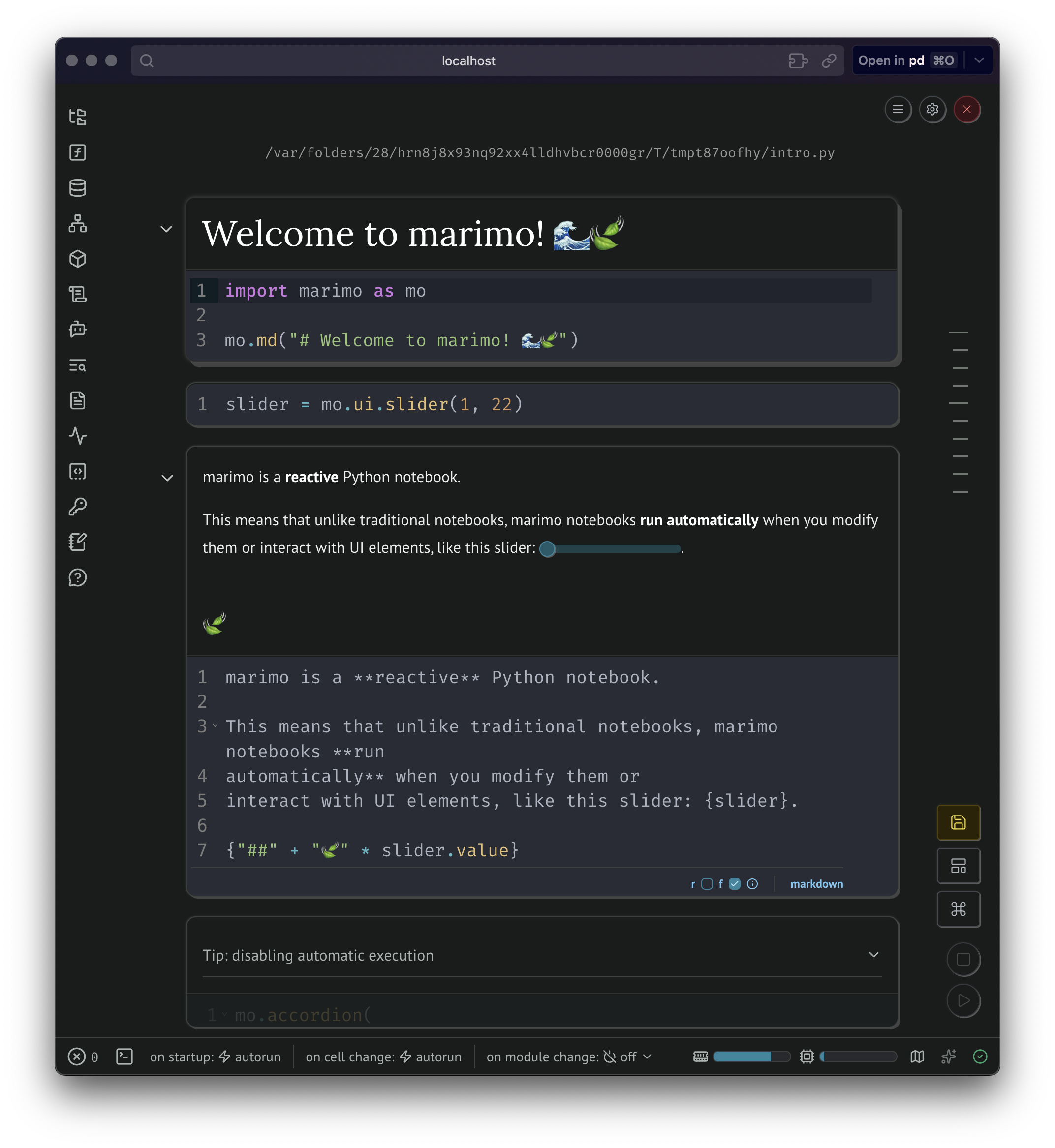 uvx marimo tutorial introAnd your default browser should open a window showing marimo.